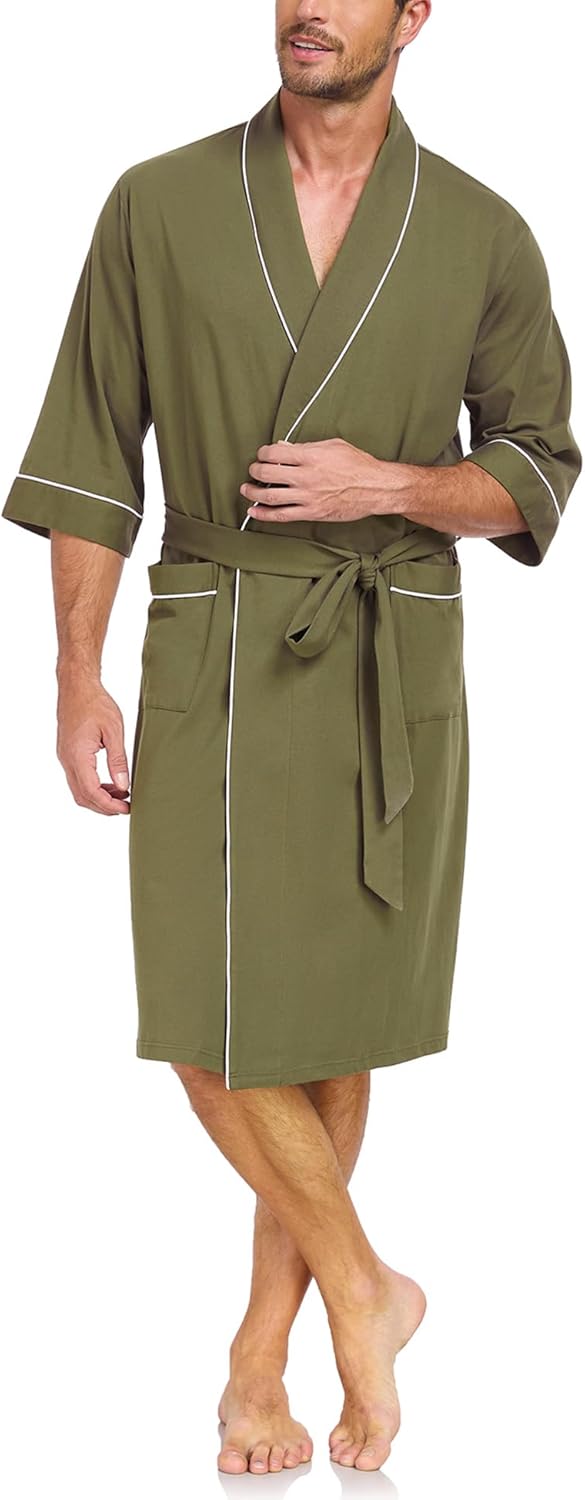 100% Cotton Men’s Lightweight Robe Summer Short Sleeve Bathrobe Soft Knee Length Robe with Pockets